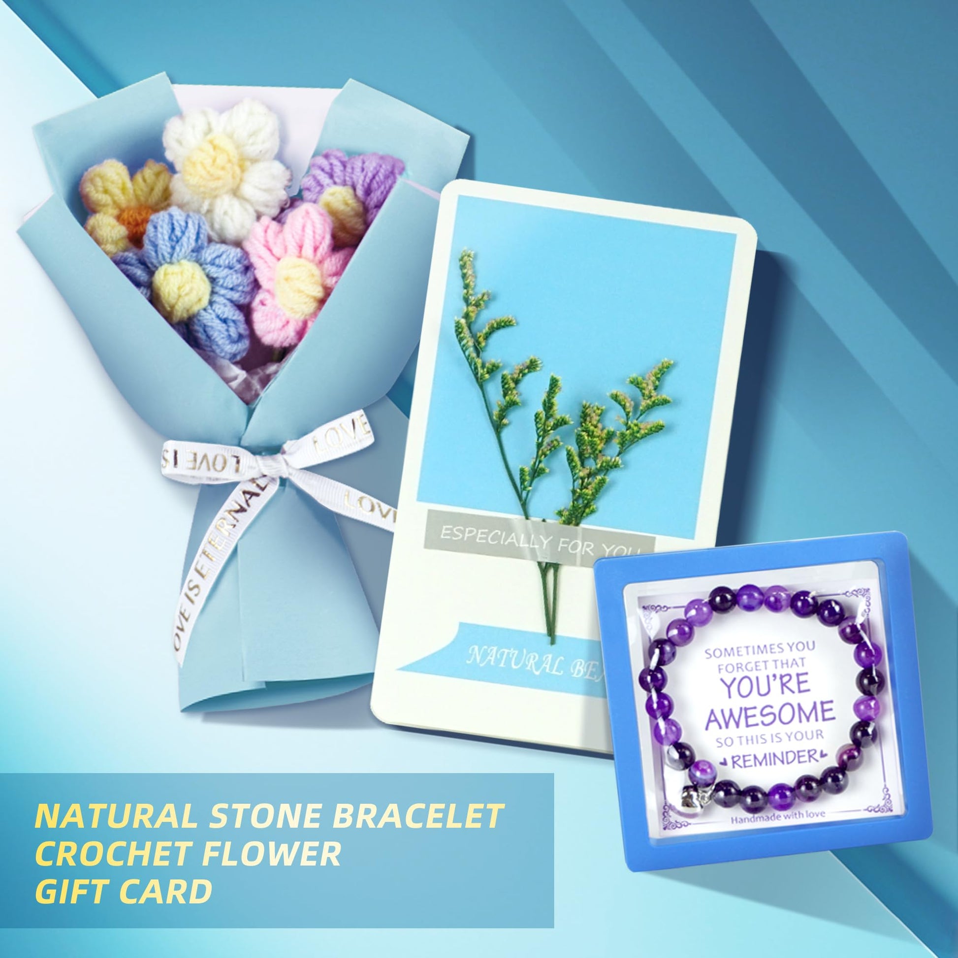- NATURAL STONE BRACELET & CROCHET FLOWER: The bracelet is made of 8 mm natural agate stone, which can bring her luck, wisdom and strength. The elastic rope fits most wrists. A bouquet of delicate handmade crochet flower create a warm moment for her and leave her with an impressive holiday memory.