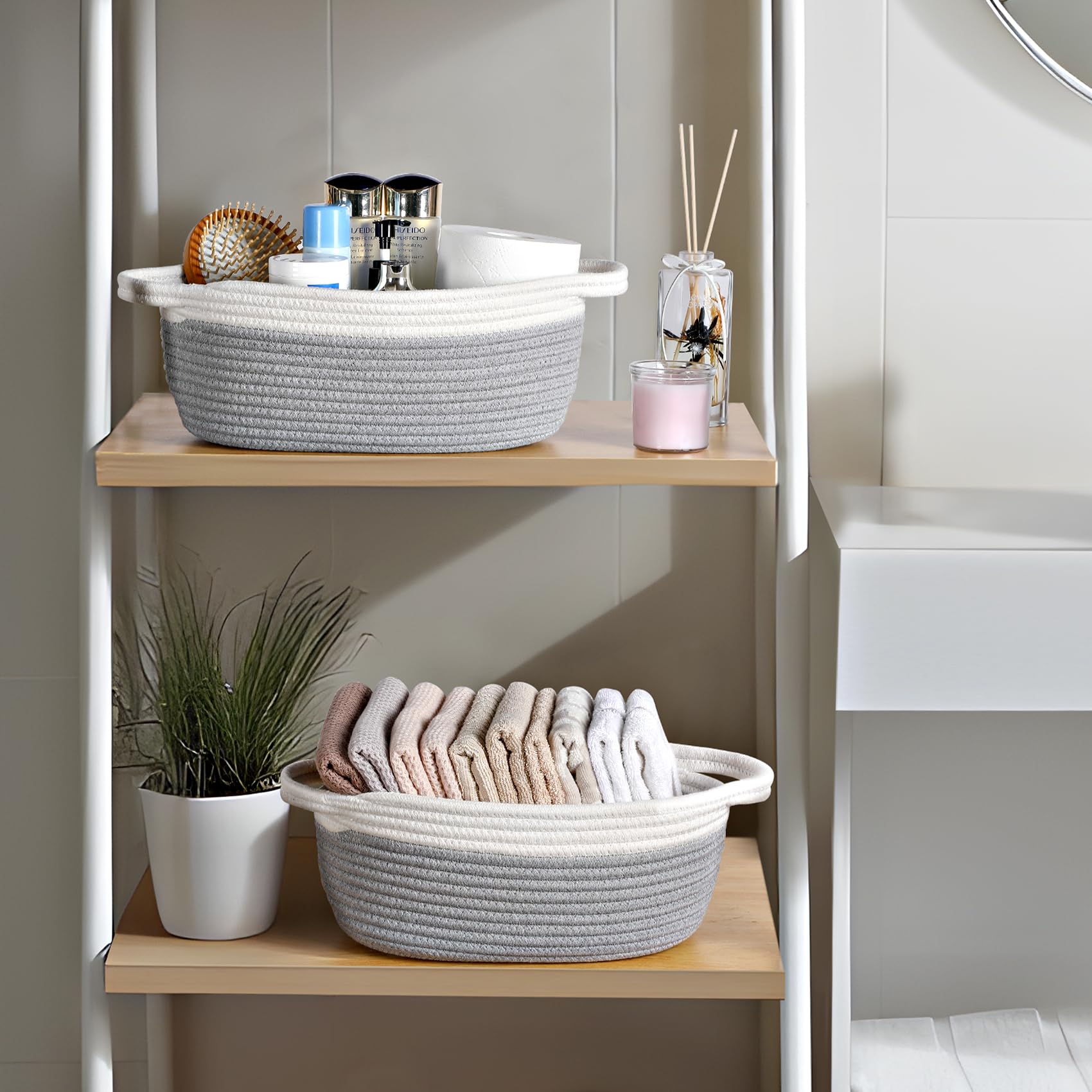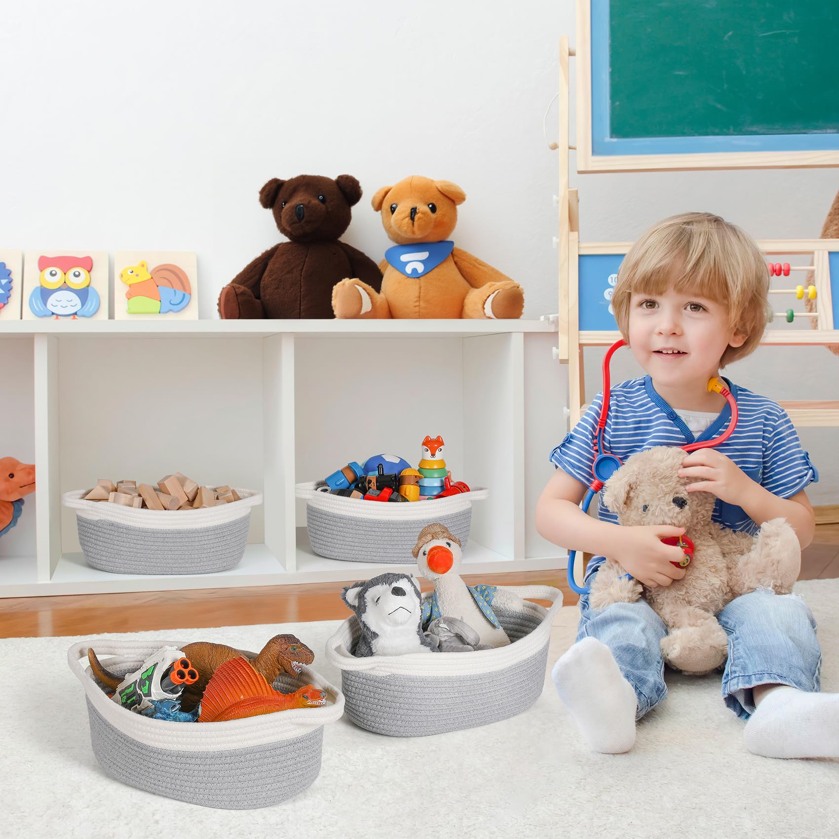 - Organic Cotton Woven: Our small woven basket is made of 100% organic cotton, 4 Pack grey 12'x 8'x 5', this makes the material incredibly soft and gentle, ensuring its safety for babies. The natural cotton rope used in weaving is free of harsh chemicals, making it a reassuring choice for families with young ones.