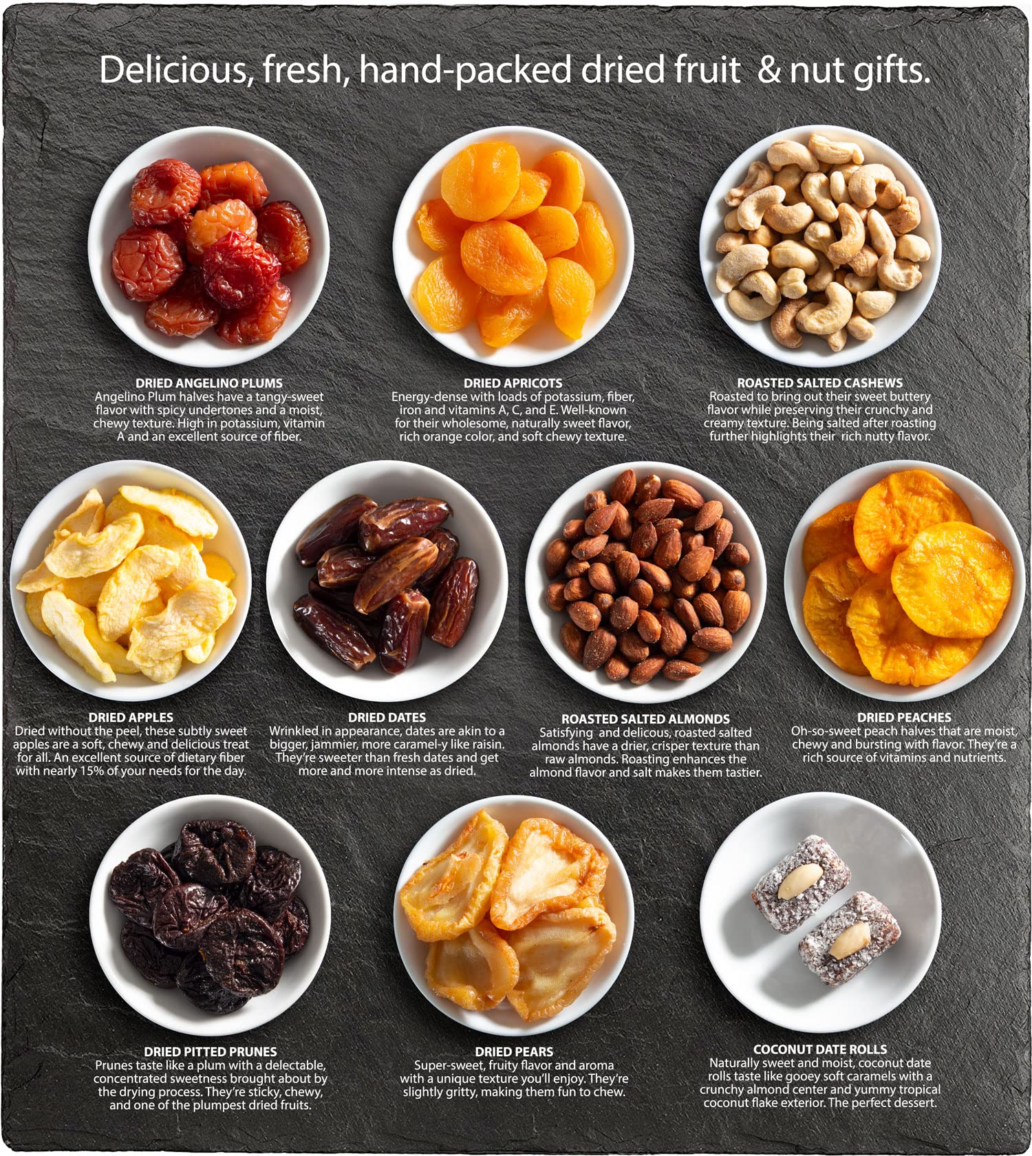 - Lots of dried apricots, peaches, plums, pears, dates and date rolls and prunes with large cashews and almonds